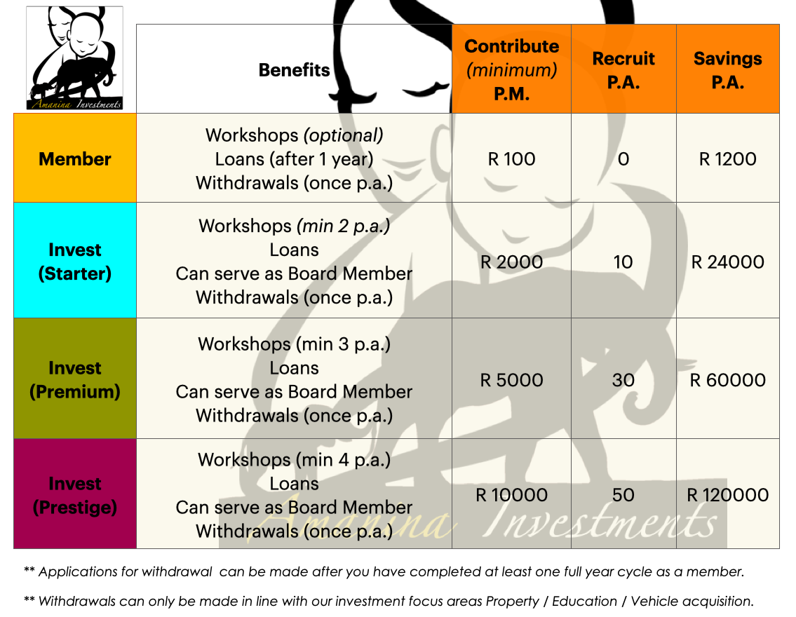 Amanina Investments is an organisation started by women for informing, educating and empowering women to create an investment based and debt free financial future for our members. While the organisation is women founded and managed we offer savings and investment opportunities for women, men and children. We are currently recruiting new members as part of our initiative to register as a  Co-orperative Financial Institution.